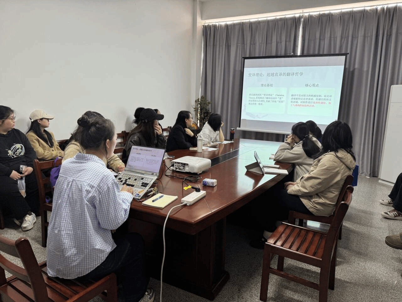 交流互动环节,现场师生围绕吴梦、程明慧两位同学的分享展开深入探讨,老师们分别对两人的研究予以肯定,并提出针对性优化建议。针对吴梦的分享,老师们认可其研究在翻译理论与实践结合上的探索价值,同时从多方面给出改进意见:柯细香教授建议扩充篇章分析维度,完整呈现文本逻辑衔接与结构连贯性,避免零散表述;陈奇敏副教授指出需规范PPT学术用词,核查“读者中心主义”等易引发争议表述的学术标准,厘清理论概念边界,明确“改”“增”“补”等翻译策略的界定与分类标准,提升研究严谨性。老师们还鼓励其继续打磨案例与概念,增强研究结论的学术可靠性。