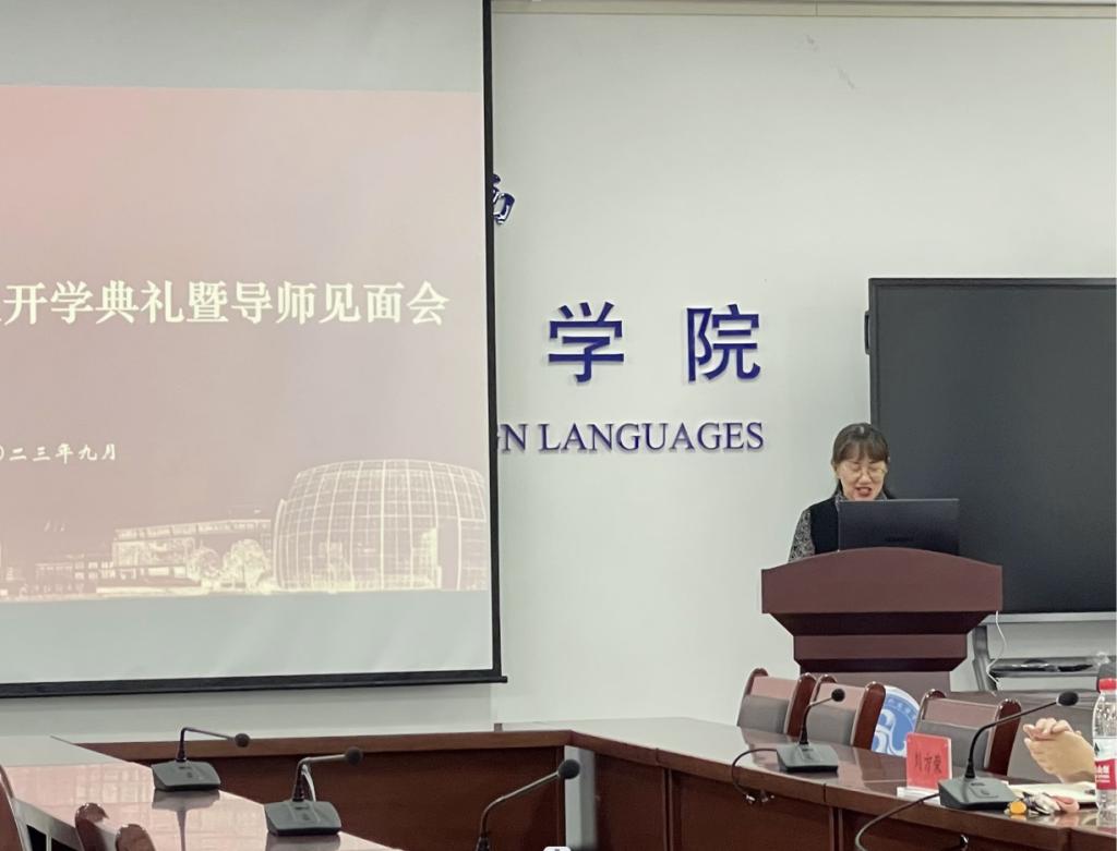 会议伊始,谭燕保院长代表学院对2023级全体研究生新生表示了热烈欢迎,并提出要求:要像个成年人(be a man) 。一是要正视自己的欲望,在行动上和逻辑上要保持高度一致;二是作为一个成年人,要果断地拿得起、坚定地扛得住、平静地放得下。在学习和生活方面,谭院长提出要学会利用量化的方法,并给出八个具体的量化指标:一是阅读量,二是写作量,三是翻译量,四是运动量,五是比赛量,六是证书量,七是朋友量,八是微笑量。她希望全体2023级MTI研究生能在纺大学有所成、求学愉快。