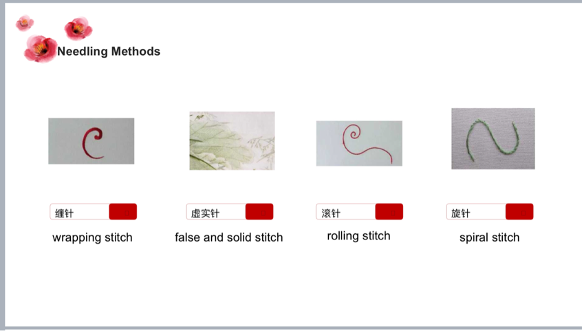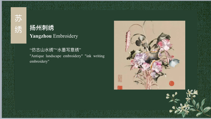 第二位汇报人秦笑眉同学分享的主题是湘绣。在对湘绣首幅人物题材的双面全异绣《杨玉环》进行简单的介绍后,她详细分析了关于湘绣的专业术语及翻译,如“鬅毛针”译为fluffy stitch、“蚁蠕针”译为worming ant stitch等。最后,秦笑眉同学为同学们讲解了湘绣和汉绣图案的差别并进行了总结。