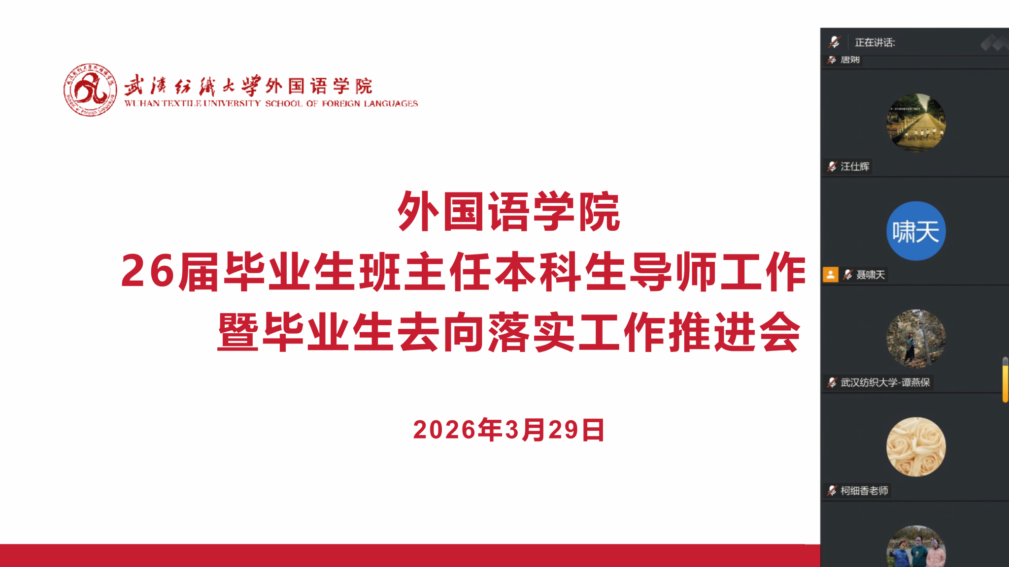 为精准做好毕业生就业分类指导与服务工作,3月29日晚,WilliamHill中文通过线上平台召开毕业生去向落实工作推进会。学院领导班子全体成员、毕业班班主任、本科生导师及毕业年级辅导员参加会议,会议由党委副书记彭阳慈航主持。