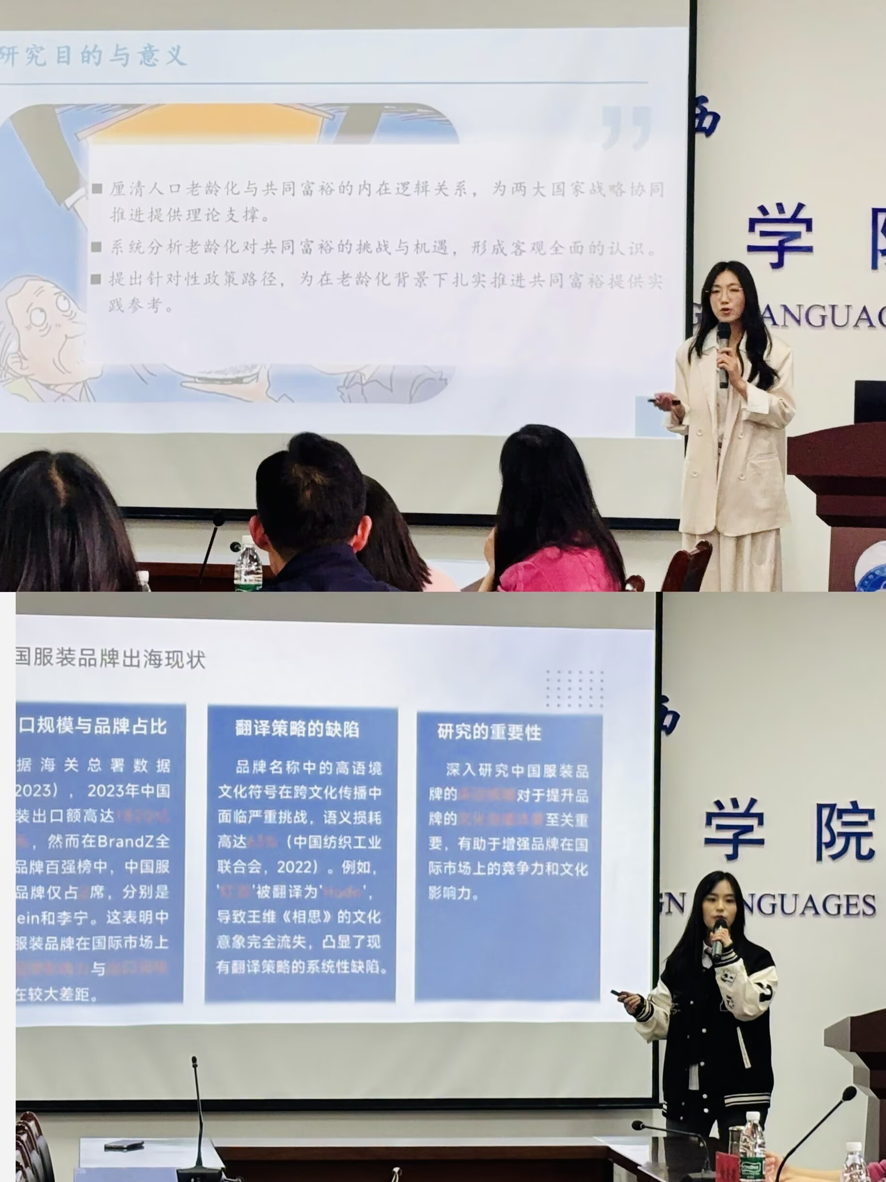本次论坛上,来自管理、经济、外语及马克思主义学院的20名研究生依次登台,从研究背景、理论框架、实证分析到结论展望,围绕各自研究领域分享了最新研究成果。研究成果主题多元,既有聚焦数字经济与绿色发展的研究,如人工智能应用与企业污染治理、数字普惠金融与农业绿色技术创新、智慧供应链与企业可持续发展等经管类热点议题;也有立足文化传播与语言研究的探索,如中国服装品牌名称英译策略等文化外译类成果;更有扎根中国实践的理论思考,涵盖乡村振兴、共同富裕、基层党建、人口老龄化等马克思主义理论相关课题,充分展现了我校人文社科领域研究生扎实的学术功底、开阔的研究视野与创新的思维能力。