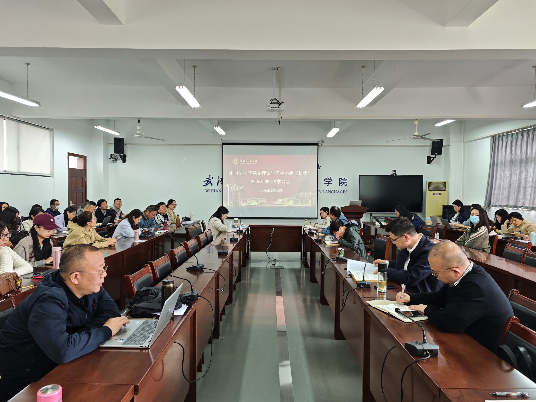 4月23日下午,WilliamHill中文在04-303会议室举办树立和践行正确政绩观学习教育专题读书班暨党委理论学习中心组(扩大)学习会。学院党委书记汪仕辉主持会议,学院班子成员、党委委员、全体教职工参加学习。