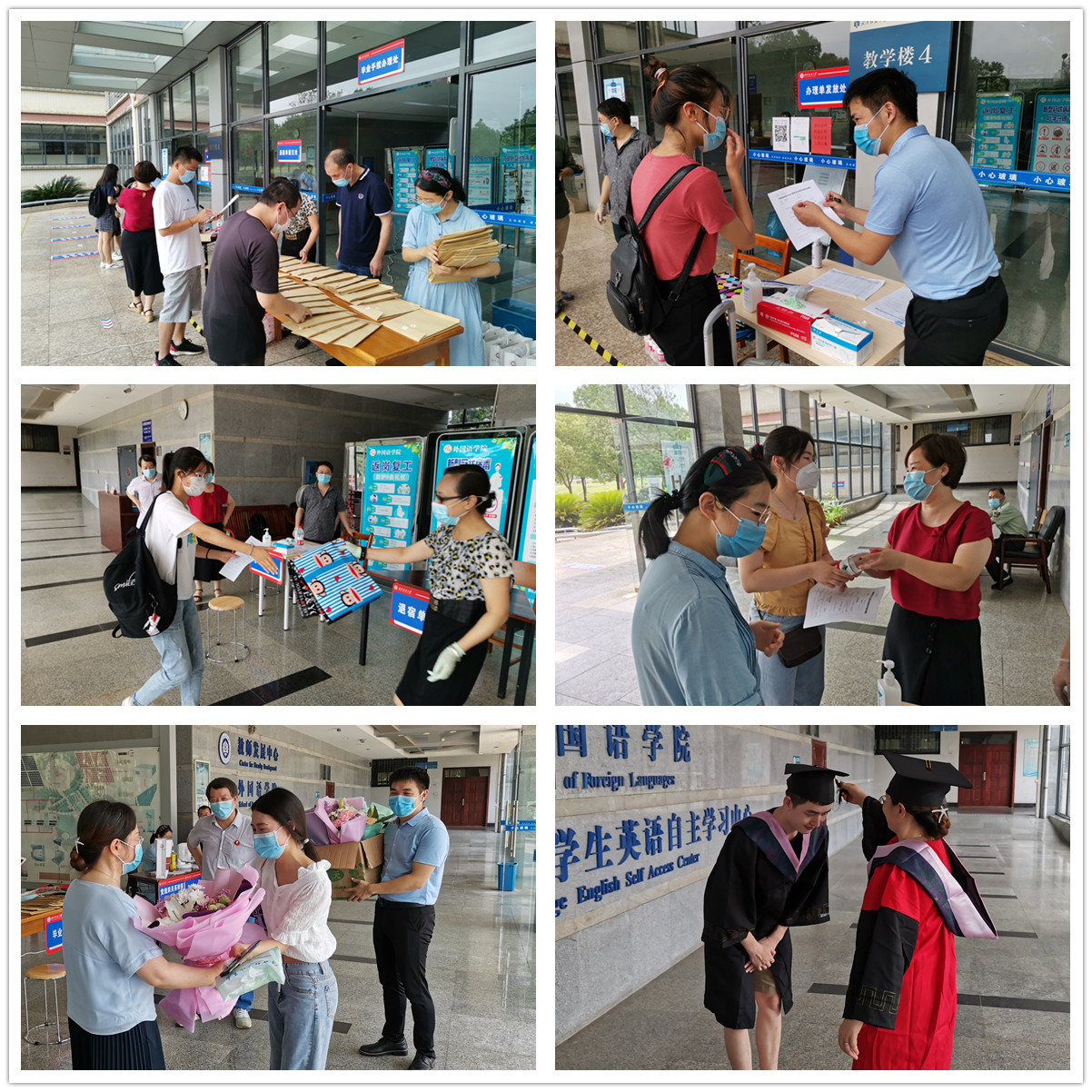 毕业生返校期间,学院老师积极参与毕业生接送、行李打包搬运工作,自驾私家车频繁往返于校门口、地铁站、宿舍楼、教学楼、快递点等地,最大限度减轻学生负担,提高运转效率。院长谭燕保每天坚持为毕业生拨穗、与毕业生合影留念,学院党委书记胡中原每天坚持送走最后一个毕业生才下班,毕业班辅导员阎浩被毕业生戏称为最敬业的“滴滴司机”,还有副院长柯群胜、罗绮伦,副书记王芳,院办主任刘晨昊、英语系副主任钱茂华,资深教师王敬忠、曹火群、庄小华,青年教师王越、曹福然,实验室老师邱凌云、苏晓勇,教学秘书张小燕,辅导员卫周瑶、聂啸天……老师们或是在帮毕业生打包搬运行李每天汗流浃背,或是为毕业生办理离校手续让毕业生感受离别前的温暖,处处彰显真挚的师生情谊。