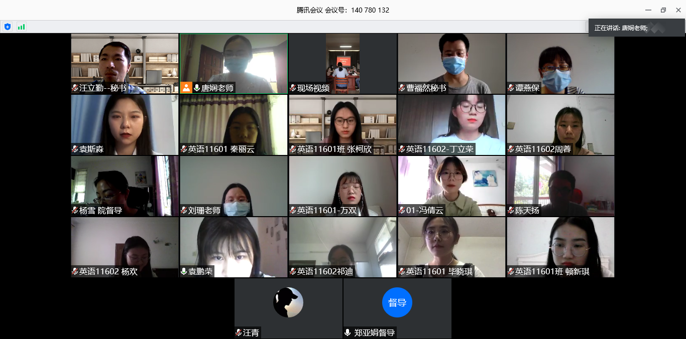 5月28日下午,受全球新冠肺炎疫情所致,在最大限度保障学生健康、安全及减少聚集的前提下,为确保我院2020届全体本科生毕业论文答辩的顺利完成,全体答辩人汇集云端,分别就各自的本科学士学位论文展开学理性论述,并就答辩组导师的提问展开理论性应处。教务处处长何畏到答辩现场对答辩工作进行了指导,本次答辩工作由学院教学副院长罗绮伦统筹协调,并由英语系副主任唐娴老师具体执行推进。