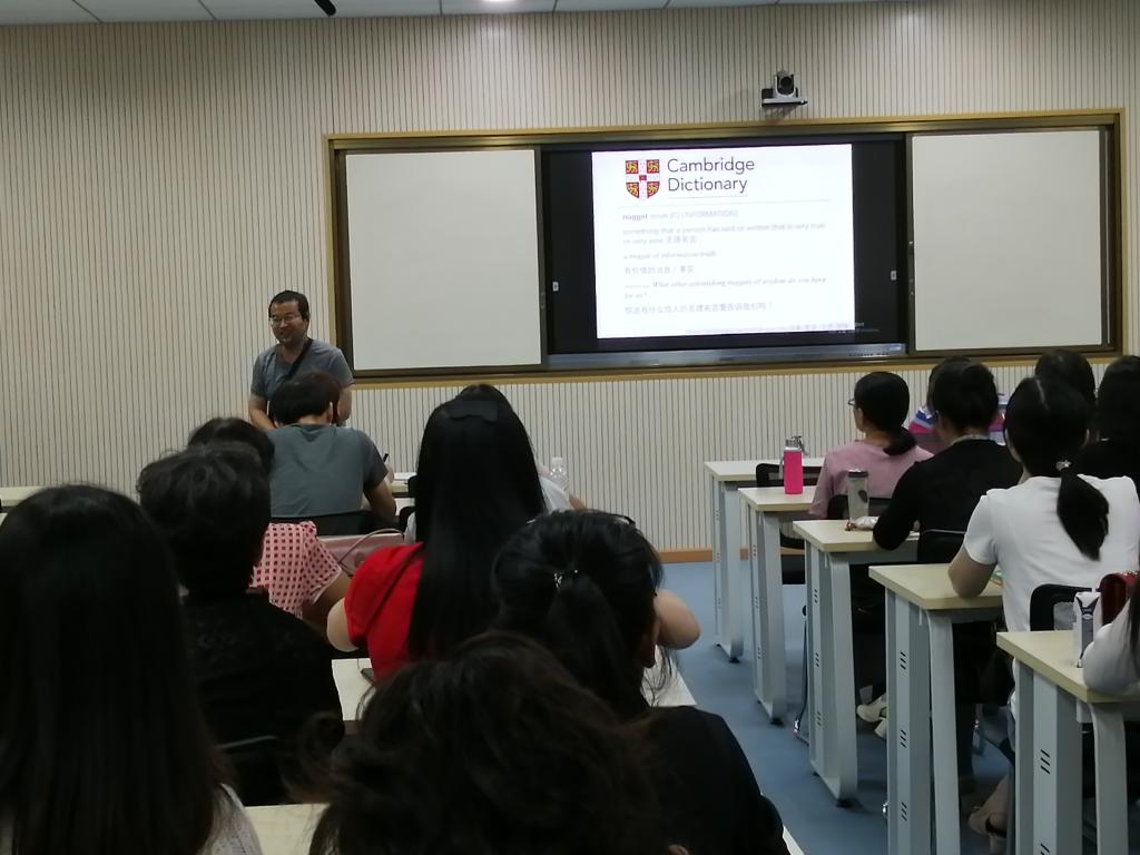 曾老师以网络词汇“干货”的英文翻译为切入点,从网络搜索技术的运用、语料库的使用以及搜索工具软件的使用三个方面向在座教师分享自己在教学、科研资源搜索及相关搜索翻译工具的获取经验。其中,在网络搜索技术运用方面,他着重就行业知识、垂直搜索、交叉验证阐述了自己的使用心得。
