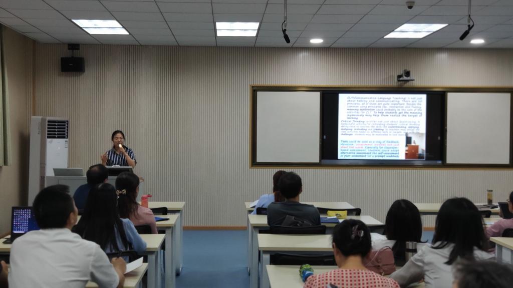 其次杨雪老师从交际教学法,思辨教学,英语测评等方面阐述了学习心得,向老师们展示了交际教学法的10条准则,并提出,有创意地让学生领会语言的含义是提升语言学习积极性的一种有效方式。之后,她着重介绍了Assessment for Learning (促学性评价)测评理念,详细分析了测评的五大原则(Practicality,Reliability,Validity,Authenticity,Washback)及其对教学的影响,深入分析了Formative Assessment在促进教师改善教学方面的积极作用,并对比展示了传统Holistic Scoring (整体评分法)以及国际先进的Analytic Scoring(分项评分法)评价量表,以及学生课堂评价自评、互评样表,并提出评价量表的使用对英语课堂教学会有积极的反拨作用。