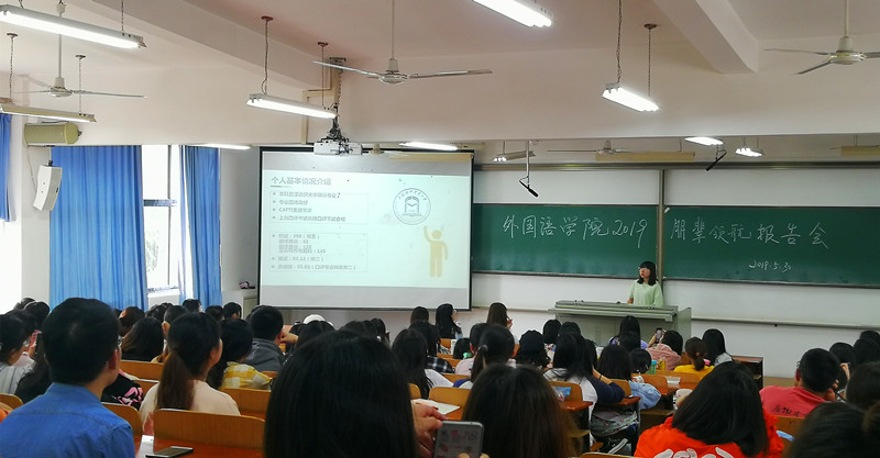 讲座伊始,考取上海对外经贸大学的英语11501班梅桂上台分享了自己的考研备考经历,她从专业选择、学校选择、复习计划和备考心得等方面进行了阐述,并向同学们推荐了很多网络学习资源。