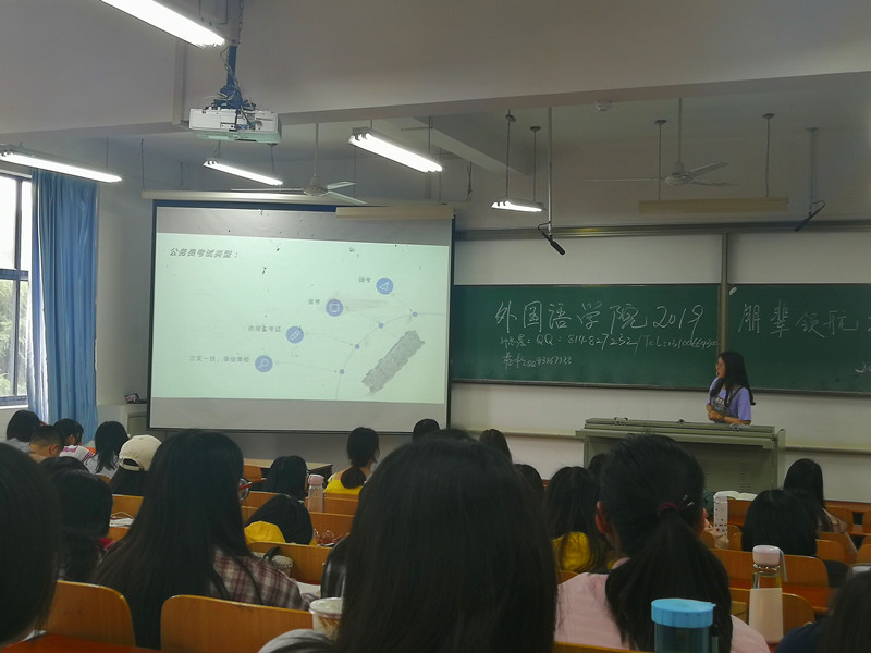 最后,成功考取恩施州选调生的英语11501班向钰向学弟学妹们介绍了自己的“公”考之路,她向同学们分别介绍国考、省考、选调生以及“三支一扶”等项目,从笔试和面试两方面进行经验介绍,激励学弟学妹们做最自信的自己。