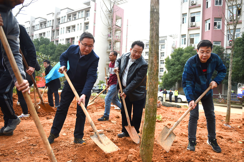 在现场工作人员的指导下,校领导和师生们拿着铁锨、水桶等工具,投身到热火朝天的植树活动中。师生们挽起衣袖,两两合作,一人扶树,一人培土,为一棵棵银杏树安置“新家”。植树活动中,师生有效配合,相互交流,增进了解,其乐融融。千余棵银杏树为学校的绿色校园景观又增添了一道风景线。