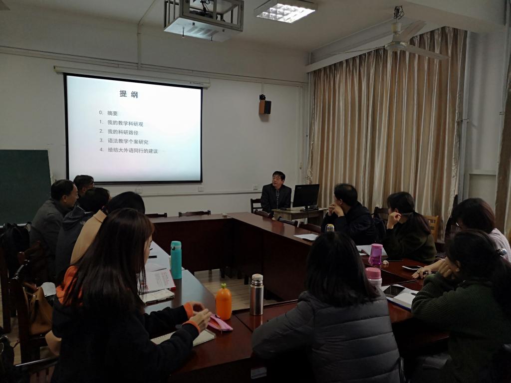 12月3日上午,对外经济贸易大学教授、博士生导师、国务院学位委员会“外国语言文学”学科评议组成员、教育部全国大学外语教学指导委员会副主任委员向明友教授受邀来我院做了题为“我的教学科研观:语法教学个案”的学术讲座。此次讲座由柯群胜副院长主持,部分青年骨干教师及研究生参与了此次讲座。