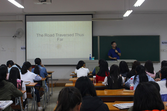 活动开始,英语11402班班长许敏芬同学率先与2017级新生进行交流。她主要针对新生们如何在大学中更好的学习生活、怎样对自己进行准确的定位发表了自己的看法,并通过与新生们的直接互动,使同学们对如何自觉、自控、自信、自醒有了更加直观的感受。接着,2016-2017年度“感动纺大榜样人物”得主、校口译队前任队长陆宇成同学针对英语学习的发展前景为大家做了详细的介绍。他现身说法,从听说读写四个方面向大家介绍了许多实用的学习方法,并衷心的祝愿同学们能够学有所成,不鸣则已、一鸣惊人。