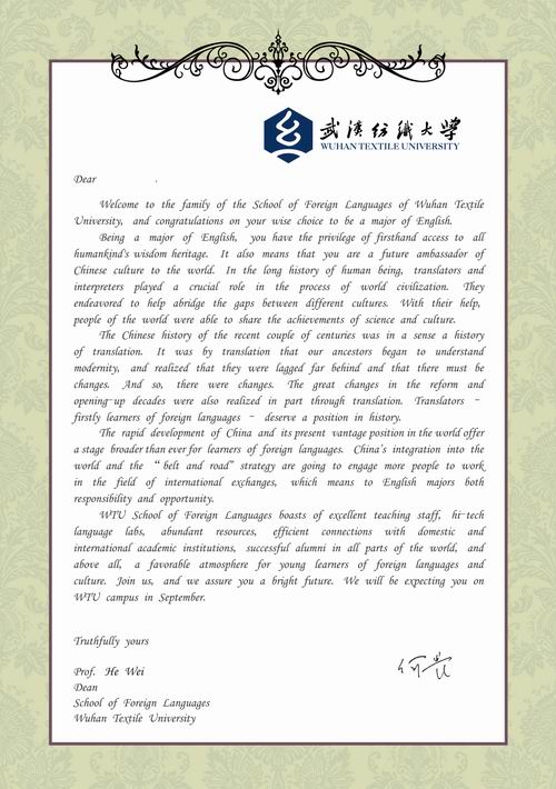院长何畏教授为WilliamHill中文2015级新生题写《致2015级新生的一封信
