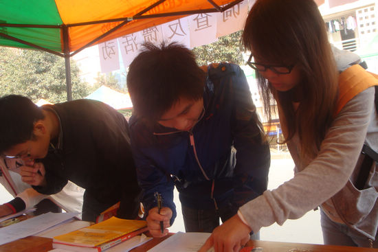 近日,在阳光校区一食堂侧门外语学院英语志愿者服务基地和学生会志愿者协会联合开展了第七届外语文化节之大学英语四六级“Hand in Hand一帮一”问卷调查反馈活动,搜集同学们今年上半年参加外语学院英语四六级“一帮一”志愿者活动反馈意见和建议,评估活动效果。