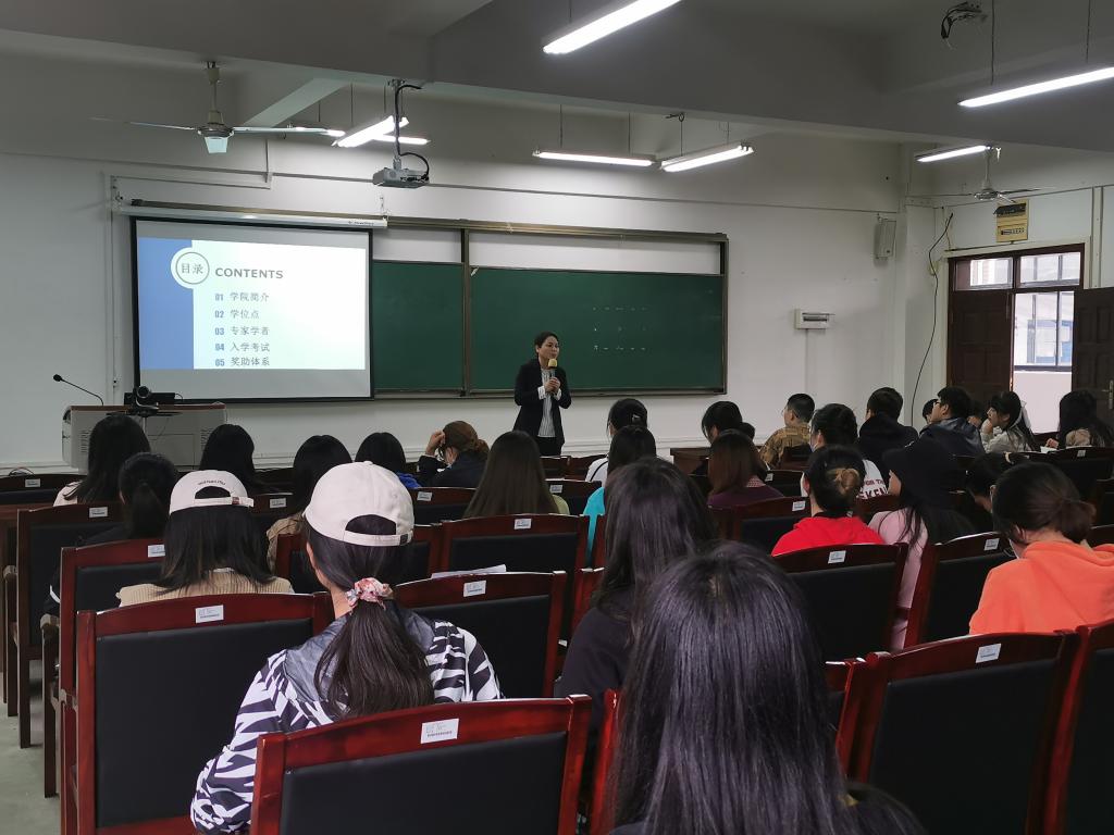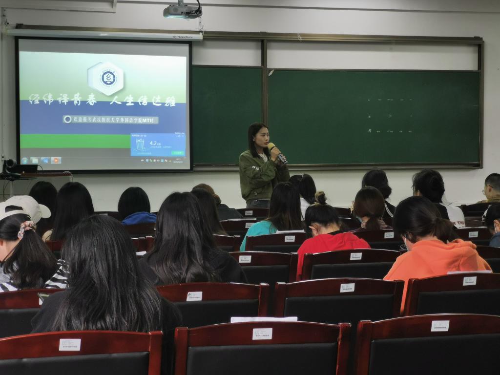 专业教师陆雪芹以“经纬译青春,人生信达雅”为主题,从学院简介、学位点、专家学者、入学考试、资助体系五个方面,向在场同学们详细介绍了本院MTI。