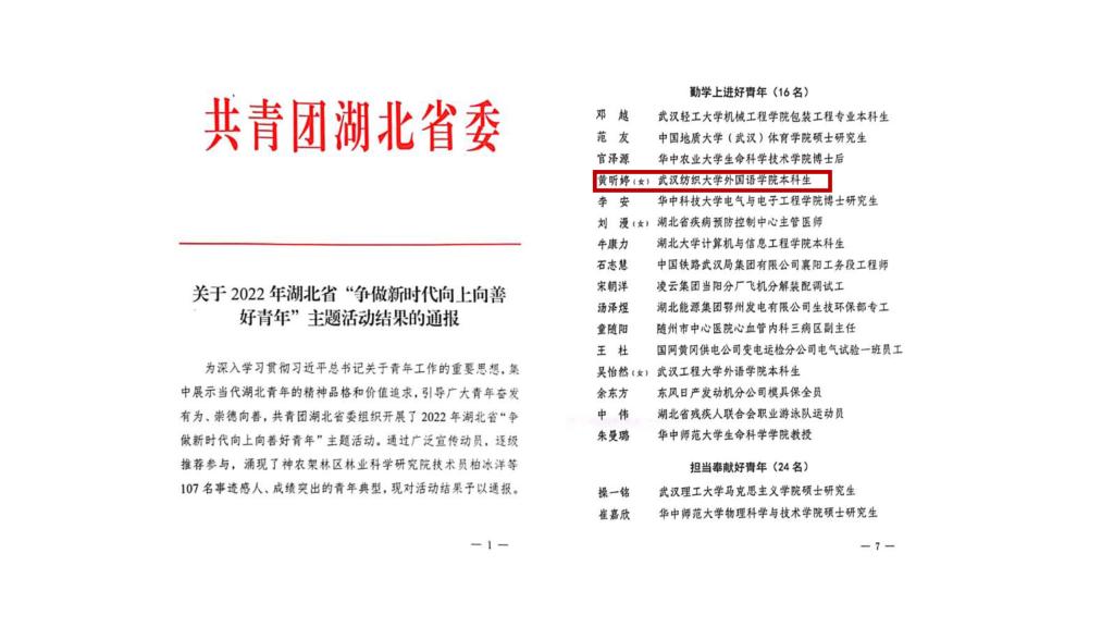 八、首次获评2022年“湖北向上向善好青年”1名,连续8年获评学校“青春力量•感动纺大”大学生榜样人物1名,学院学生综合素质取得新进步。6月,共青团湖北省委公布2022年“湖北向上向善好青年”名单,我院学生黄昕婷获评“勤学上进好青年”,成为学校唯一获得该荣誉称号学生;黄昕婷同时获评学校2021-2022年度“青春力量•感动纺大”大学生榜样人物。