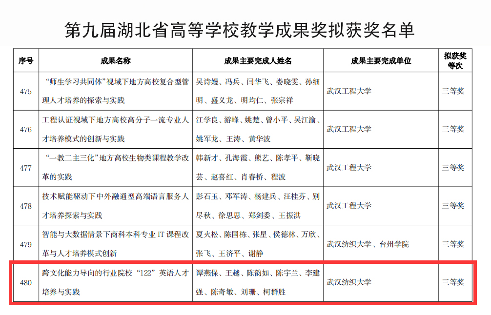 二、连续2届获评湖北省高等学校教学成果奖三等奖1项(谭燕保),获评中纺联纺织高等教育教学成果奖4项(周丹、刘丹、柯细香、唐娴),学院省部级教学成果奖取得新成绩。11月,湖北省教育厅公布第九届湖北省高等学校教学成果奖拟获奖名单,我院教师谭燕保主持《跨文化能力导向的行业院校“122”英语人才培养与实践》获评省级教学成果奖三等奖;3月,中国纺织工业联合会发布《关于授予“纺织之光”2021年度中国纺织工业联合会纺织高等教育教学成果奖的决定》,周丹主持《行业背景下综合类高校研究生公共英语立体化课程体系研究与实践》获评中纺联纺织高等教育教学成果奖一等奖,刘丹、柯细香、唐娴分别获评中纺联纺织高等教育教学成果奖二等奖。