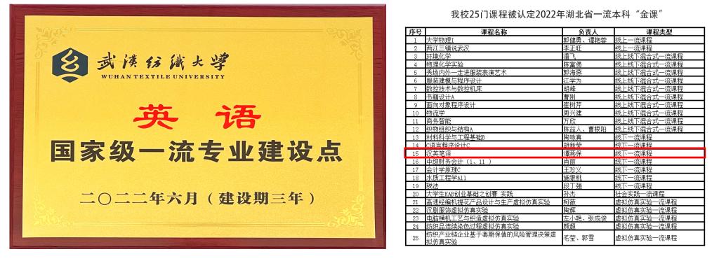 一、首次获批国家级一流本科专业建设点1项(英语专业)、湖北省省级线下一流课程1门(《汉英笔译》课程),学院专业、课程建设取得新突破。6月,教育部发布《教育部办公厅关于公布2021年度国家级和省级一流本科专业建设点名单的通知》,我院英语专业获批2021年度国家级一流本科专业建设点,成为学校17个国家级一流本科专业建设点之一;12月,湖北省教育厅发布《省教育厅关于公布2022年度省级一流本科课程认定结果的通知》,我院《汉英笔译》课程获批2022年度省级线下一流课程,成为学校7门省级线下一流课程之一。