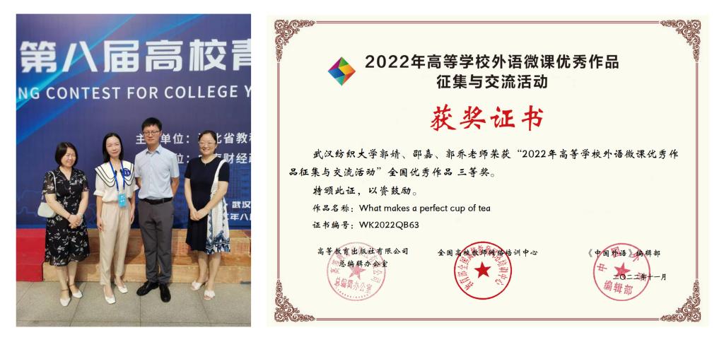 三、首次获评湖北省第八届高校青年教师教学竞赛二等奖1项(王越),学院青年教师教学能力获得新提升。8月,湖北省第八届高校青年教师教学竞赛在中南财经政法大学举行,我院青年教师王越获评二等奖,该奖项为我校教师在该项赛事中获得的历史最佳成绩。此外,王越、曹婷团队获评第二届湖北省高校教师教学创新大赛省级三等奖;郭婧、邵嘉、郭乔团队获评2022年高等学校外语微课优秀作品征集与交流活动全国优秀作品三等奖。