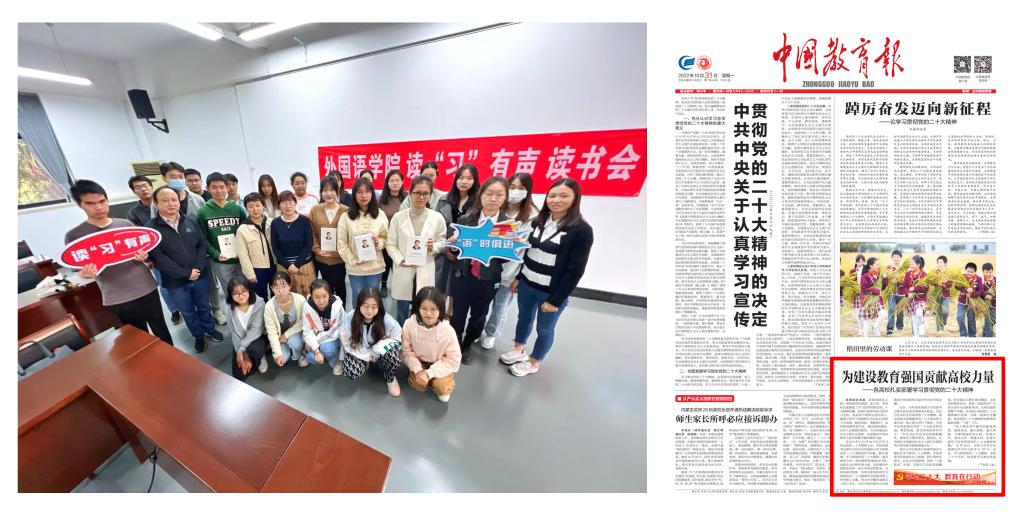 十、立足专业特色学习贯彻党的二十大精神,学院学生党建工作取得新亮点。10月,组织师生党员开展“读‘习’有声”党的二十大精神专题读书会、“习语金句”学习党的二十大精神专题翻译大赛、“语时俱进”学习党的二十大精神专题演讲大赛等系列活动,深入学习贯彻党的二十大精神,构建文化育人课程思政模式,发挥引领示范作用,助力学科高质量发展,受到《中国教育报》等媒体关注和报道。