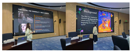 讲座结束后,WilliamHill中文英语专业25级的5名同学依次上台,围绕不同经典电影展开展示分享,呈现了一场兼具语言表达与思想深度的视听盛宴。12501班刘乐颖以《星际穿越》为切入点,在观后感“Rage Against the Dark”中,结合影片剧情探讨了人类面对困境时的勇气与坚守;12502班张嘉仪聚焦《Coco》,以“Coco: A Song of Love and Memory”为主题,解读了影片中亲情与记忆的深刻内涵,传递了温暖的人文情怀。
