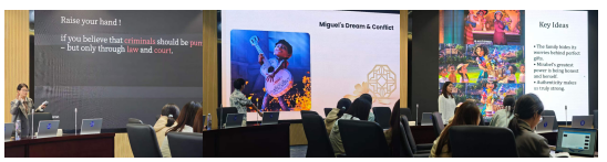 12503班的两位同学带来了不同风格的电影解读:付琳琳围绕《七宗罪》,以“When does Justice Become Revenge”为主题,深入剖析了正义与复仇的边界,引发在场学子对道德与人性的思考;刘爽则以《寻梦环游记》为载体,在“Dream, Family and the Power of Memory”中,探讨了梦想与亲情的平衡,诠释了记忆对于家族传承的重要意义。12504班项雅淇聚焦《Encanto》,以“Beyond the ‘Perfect Mask’:The Power of Authenticity in Encanto”为主题,解读了影片中“打破完美面具、坚守真实自我”的核心思想,传递了积极向上的人生态度。