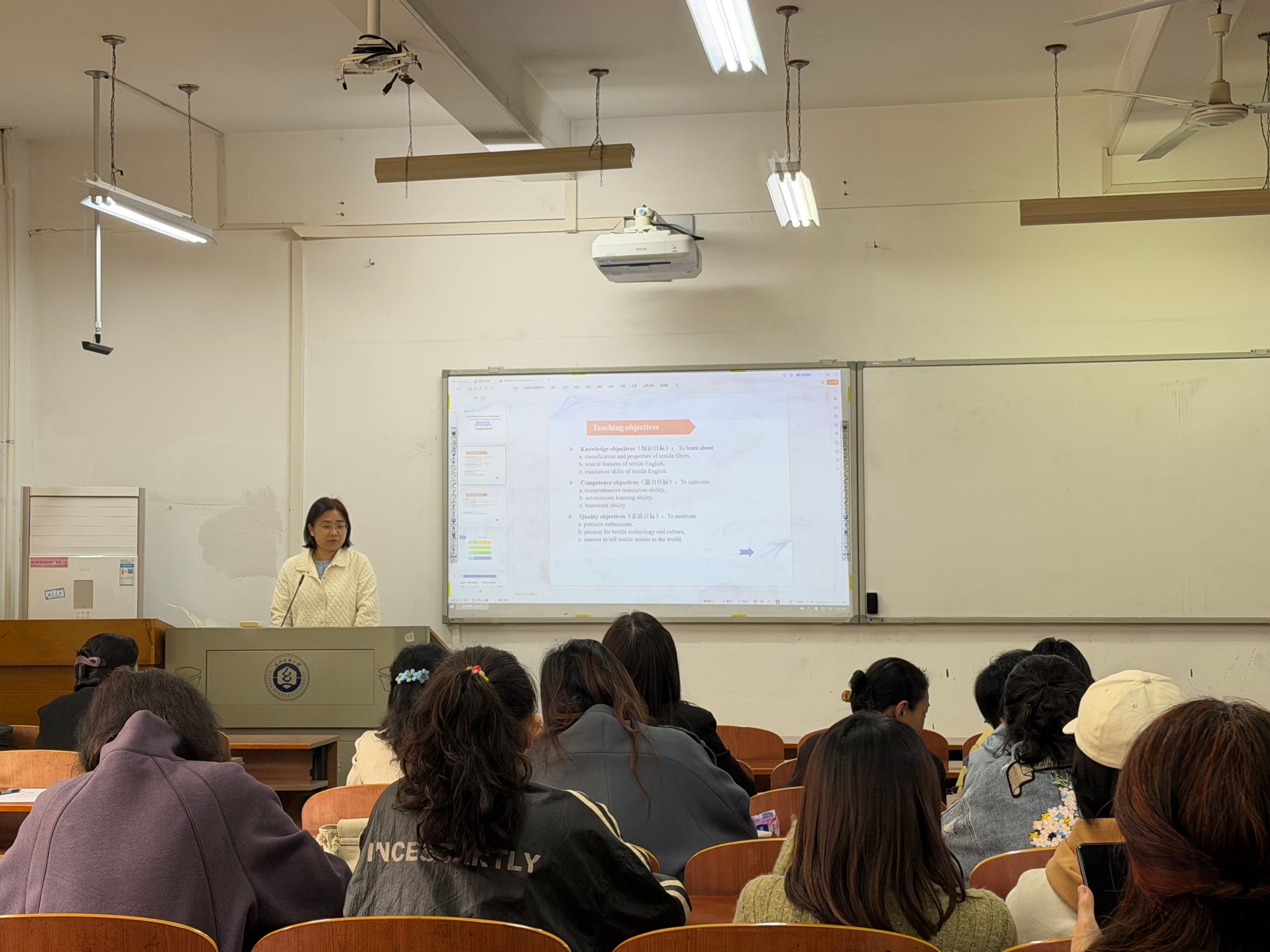 郑亚娟老师带来《纺织科技翻译》课程示范,创新性运用“产出导向法(POA)”开展教学。在驱动阶段,她以 “校英文网站编辑翻译月面国旗新闻” 为真实任务,融入纺织专业词汇,激发学生学习内驱力与挑战欲;促成阶段,将任务拆解为纺织纤维分类、科技词汇特征、翻译技巧三大模块,为学生搭建学习脚手架;评价阶段,依托学习通完成线上测试与翻译输出,实施过程性评价,以评促学、迭代提升。课堂中自然融入黄道婆、嫘祖纺织文化及徐卫林院士团队月面国旗研发故事等思政元素,将专业学习与文化自信、科技报国理念有机结合,实现知识传授与价值引领同向同行。