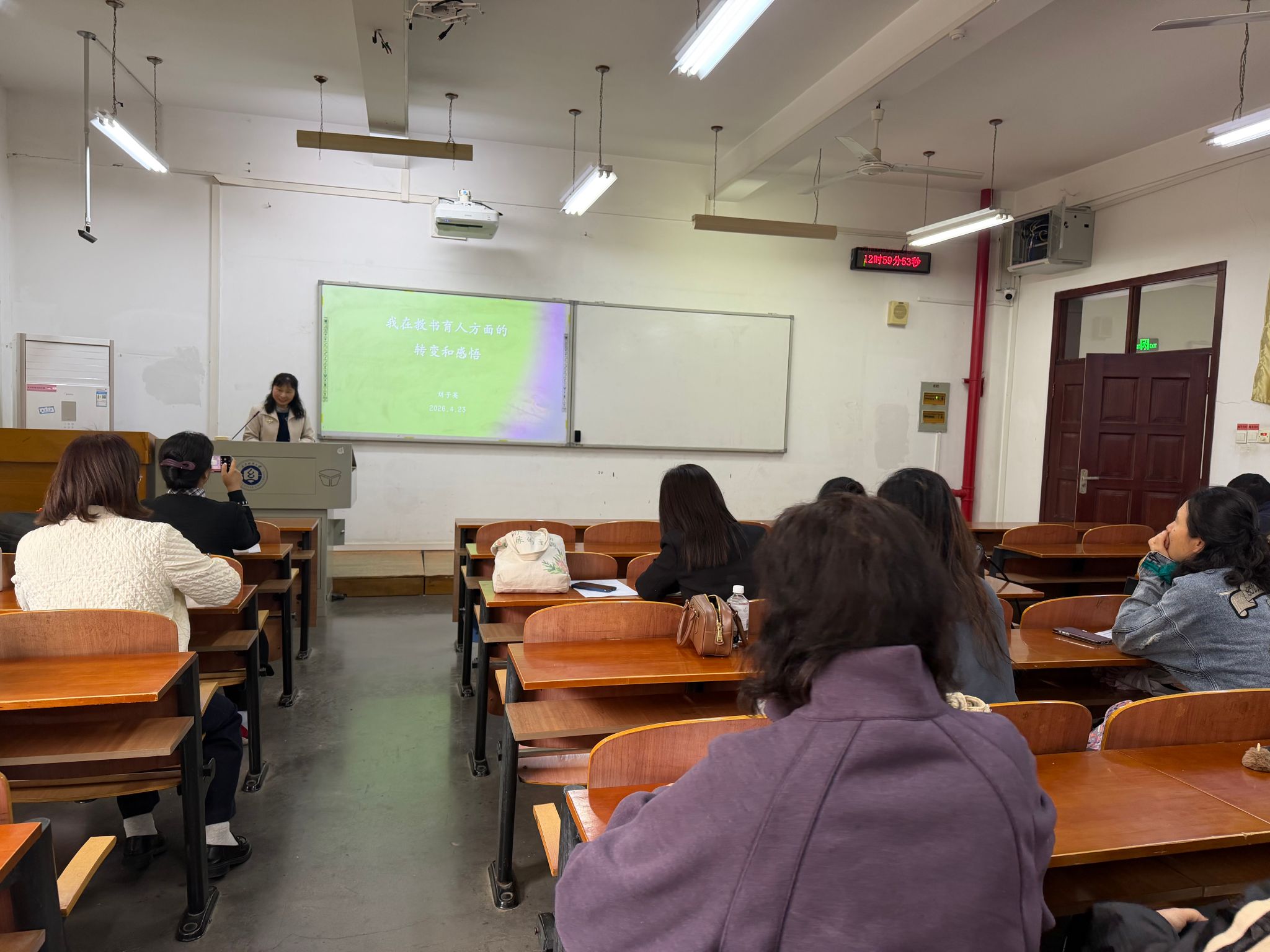 4 月 23 日下午,大英一部与二部全体教师在YG03-102教室开展了教学观摩研讨活动。本次活动由杨雪主任主持,刘子英与郑亚娟两位老师进行经验分享与专题教学示范,全体教师参与交流研讨,共同探讨 AI 技术赋能下的教学创新路径,交流产出导向法在专业英语课程中的实践经验,活动氛围浓厚、研讨深入。